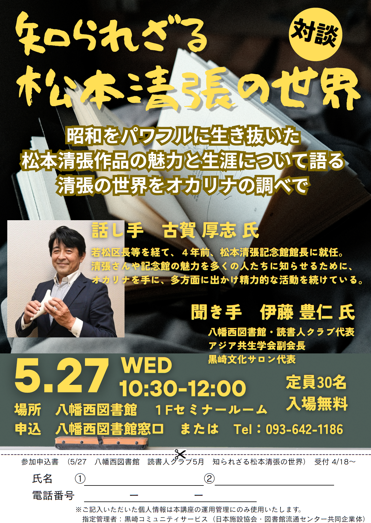 【八幡西】5/27(水)「知られざる松本清張の世界」参加者募集! 八幡西図書館、5月の読書人クラブでは、昭和をパワフルに生き抜いた、松本清張作品の魅力と生涯について、対談形式で語っていただきます。 松本清張記念館の古賀館長による、オカリナ演奏もお楽しみに! ・日時 5月27日(水) 10時30分~12時・場所 八幡西図書館1階 セミナー室・定員 30名(入場無料) ※申し込み八幡西図書館窓口またはTEL:642-1186まで