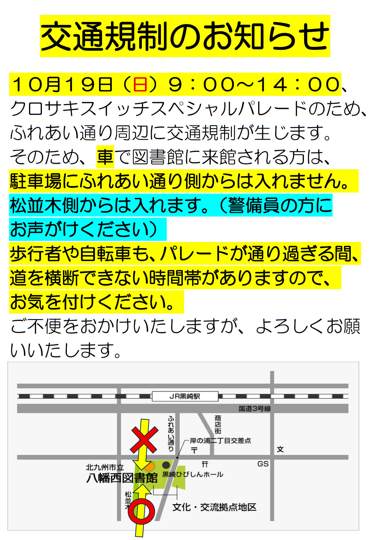 【八幡西】10/19 (日)交通規制のお知らせ 10月19日(日)9:00~14:00、クロサキスイッチスペシャルパレードのため、ふれあい通り周辺に交通規制が生じます。そのため、車で図書館に来館される方は、駐車場にふれあい通り側からは入れません。松並木側からは入れます。(警備員の方にお声がけください)歩行者や自転車も、パレードが通り過ぎる間、道を横断できない時間帯がありますので、お気を付けください。ご不便をおかけいたしますが、よろしくお願いいたします。